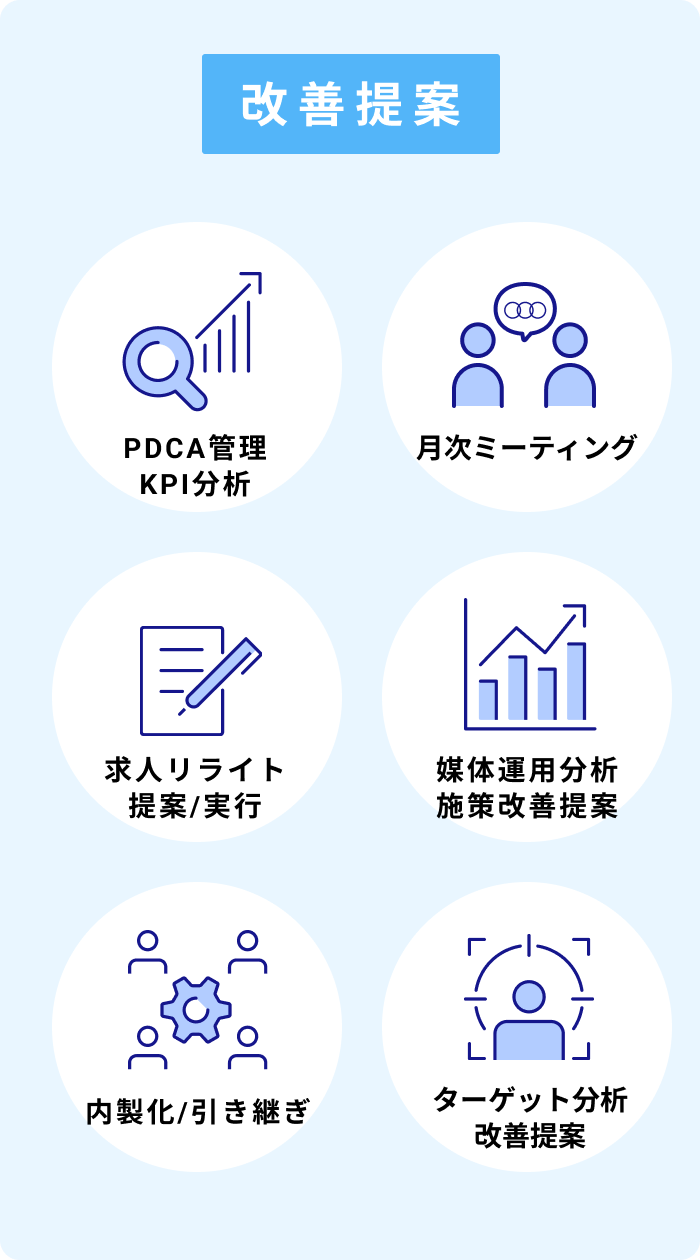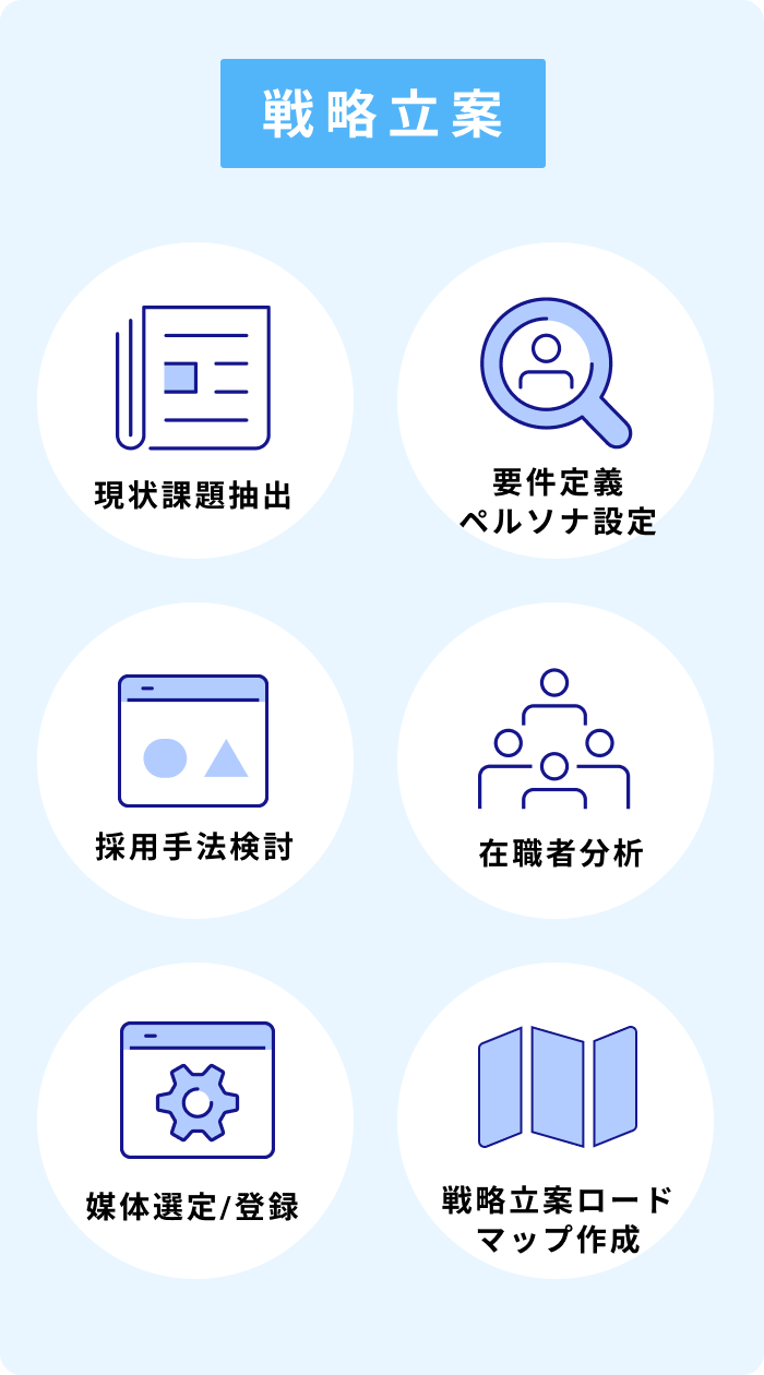コプラットの採用支援では、戦略立案→採用支援→改善提案までの全てを一貫し、アドバイスだけに留まらず、実務まで支援し、採用を成功に導きます。